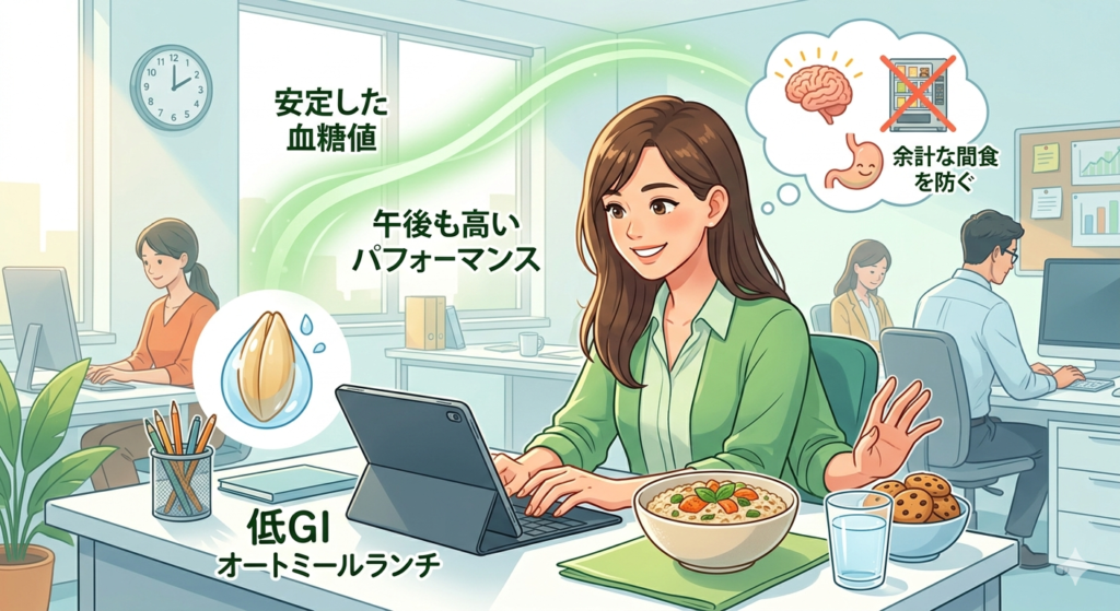 血糖値が安定することで、午後からの仕事や学習におけるパフォーマンスを高く保てる可能性があると言えるでしょう。