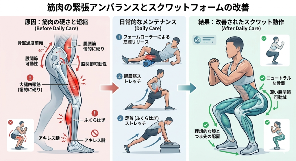 筋肉の緊張状態にアンバランスが生じており、それがフォームの崩れの根本的な原因を引き起こしている場合、日常的なボディケアとしてストレッチや筋膜リリースを積極的に取り入れることが、間接的にスクワットの動作の質を大きく向上させる可能性が考えられます。特に大腿四頭筋や腸腰筋といった身体の前面に位置する筋肉が慢性的に硬く短縮してしまっていると、骨盤が過度に前傾してしまったり股関節の自然な可動性が制限されたりする恐れがあるため、フォームローラーなどのツールを用いてこれらの部位の組織を丁寧にほぐすことが推奨されることが多いようです。また、足首の関節の硬さもスムーズなしゃがみ込みを妨げ、結果的に膝が前に出てしまう大きな要因となり得るため、ふくらはぎやアキレス腱周りの柔軟性を高めるストレッチを継続的に行うことも、複合的な改善アプローチとして非常に有効に働くかもしれません。筋肉や結合組織のコンディションを良好に保つことは、より安全で効果的なフォームを作るための強固な土台作りに他ならないのではないでしょうか。