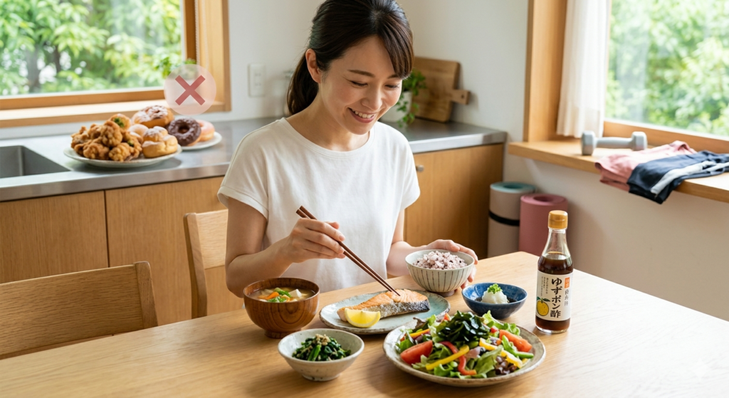 ポン酢を使って野菜や海藻を美味しく食べられるようになったとしても、それ以外の食事で高カロリーな揚げ物や甘いお菓子を大量に食べていては、望むような結果を得ることは難しいと考えられるでしょう。