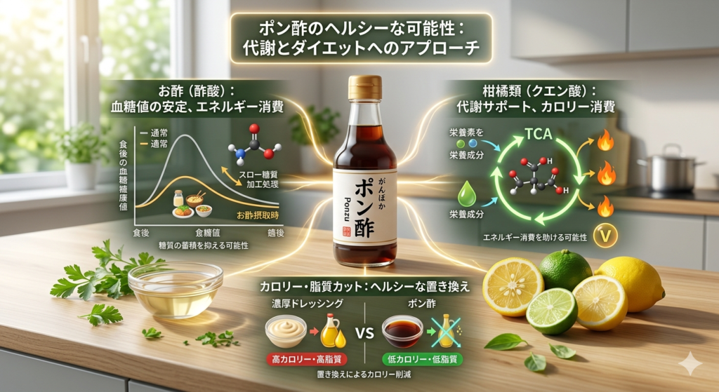 もちろん、お酢を飲めば劇的に変化するというわけではありませんが、日々の食事のアクセントとしてポン酢を活用することは、健康的な体づくりを意識する上で理にかなったアプローチの一つと言えるかもしれません。