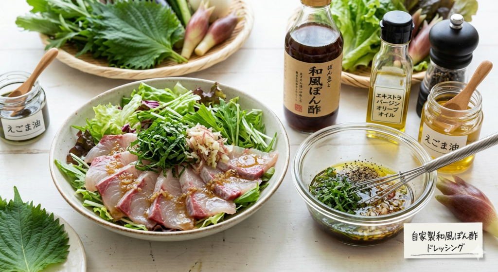 ポン酢そのままでも十分に美味しいですが、そこにオリーブオイルを少量加えたり、ブラックペッパーや刻んだ大葉、みょうがなどの香味野菜を混ぜ合わせたりすることで、本格的な和風ドレッシングやカルパッチョソースのような味わいを演出できるのではないでしょうか。