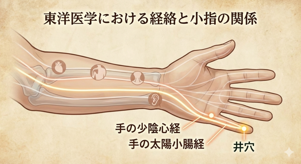 人体には「経絡」と呼ばれるエネルギーの通り道が張り巡らされているという考え方が、東洋医学の根幹には存在しています。この経絡の流れを整えることが健康維持につながるとされており、その経絡の末端、つまり「井穴(せいけつ)」と呼ばれる重要なポイントが指先には存在しているのです。具体的に小指には、手の少陰心経(しょういんしんけい)と手の太陽小腸経(たいようしょうちょうけい)という二つの経絡が通っているとされています。心経は心臓や精神活動に深く関わり、小腸経は肩や首、耳などの器官に関連していると言われています。