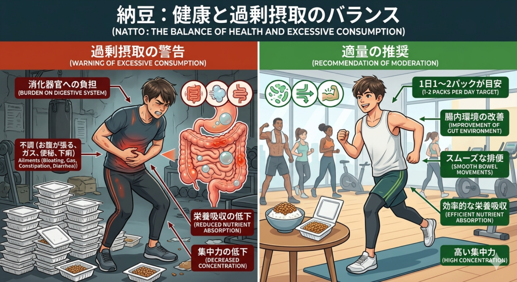 納豆は筋トレ愛好家にとって多くのメリットをもたらす可能性がある食材であると考えられますが、手放しでいくらでも食べて良いというわけではないようです。