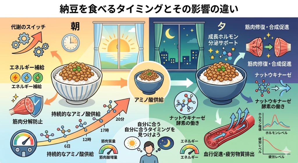 吸収が緩やかな大豆タンパク質を含む納豆を朝に食べることで、日中にかけて持続的にアミノ酸を供給し続けることができるかもしれないというメリットも考えられます。