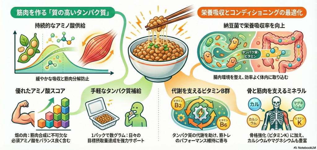 筋トレを行う際の食事において、納豆が好んで選ばれることには、いくつかの理由が存在していると考えられます。