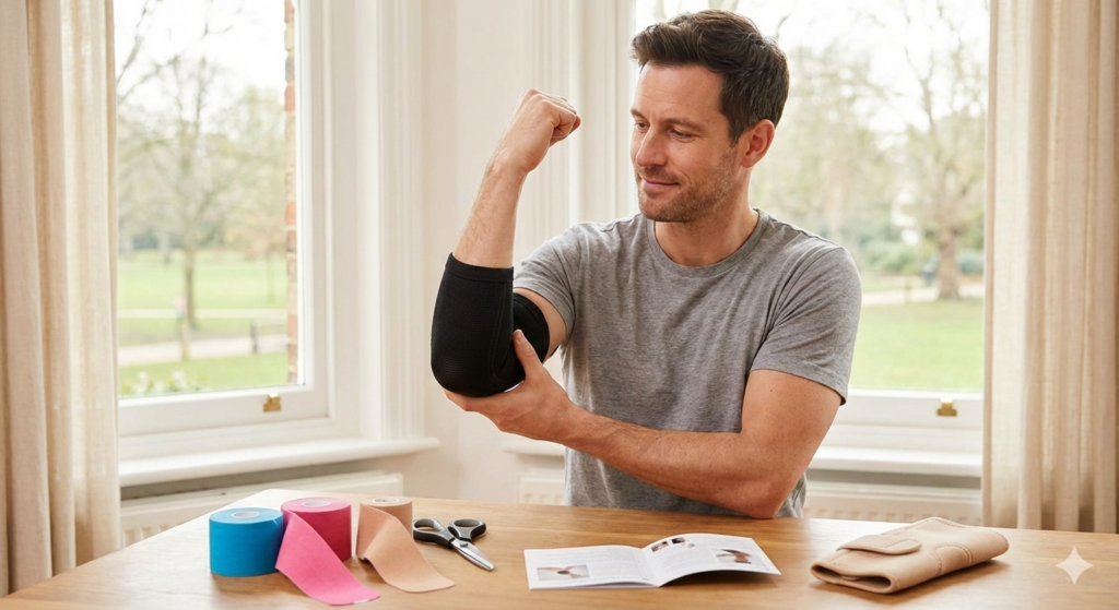 日常生活を送る上でも肘を曲げ伸ばしするたびに違和感がある場合や、痛みが少し和らいで慎重にトレーニングを再開しようとする段階においては、外部から関節を物理的にサポートするアイテムの活用を検討してもよいかもしれません。肘専用の弾性サポーターを装着することで、関節に適度な圧迫感が加わり、無駄なブレやねじれの動きが制限されるため、動作の安定感が増して痛みが緩和される効果が期待できると言われています。また、保温効果のある素材で作られたサポーターであれば、関節周辺の冷えを防ぎ、血流を良好に保つ手助けにもなるでしょう。さらに、スポーツテープの一種であるキネシオロジーテープなどを解剖学的に正しい方法で貼ることで、皮膚がわずかに持ち上げられて筋肉の滑りが良くなったり、関節や靭帯にかかる負担が部分的に軽減されたりする可能性も考えられます。ただし、これらはあくまで一時的な痛みの軽減や補助的な手段であり、フォームの改善や十分な休息といった根本的な原因の解決にはならないかもしれない点に十分に留意する必要があるでしょう。