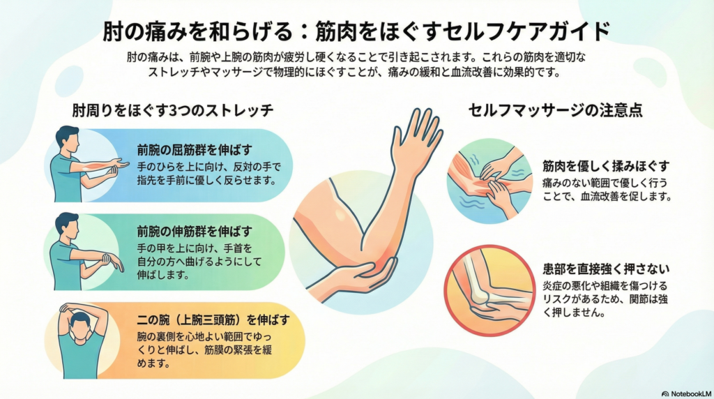 ・前腕や上腕三頭筋の柔軟性を高めるストレッチが肘関節周辺の過度な緊張を和らげる効果をもたらす可能性がある