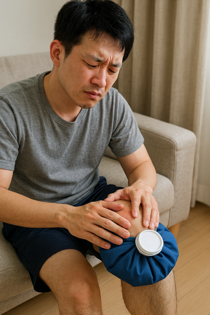 急に膝の外側が痛くなった直後、特に熱感や腫れを伴う場合に推奨されるのが、RICE処置と呼ばれる基本的な応急処置です。これはRest(安静)、Icing(冷却)、Compression(圧迫)、Elevation(挙上)の頭文字をとったもので、炎症の拡大を防ぎ、痛みを緩和するための初期対応として広く知られています。