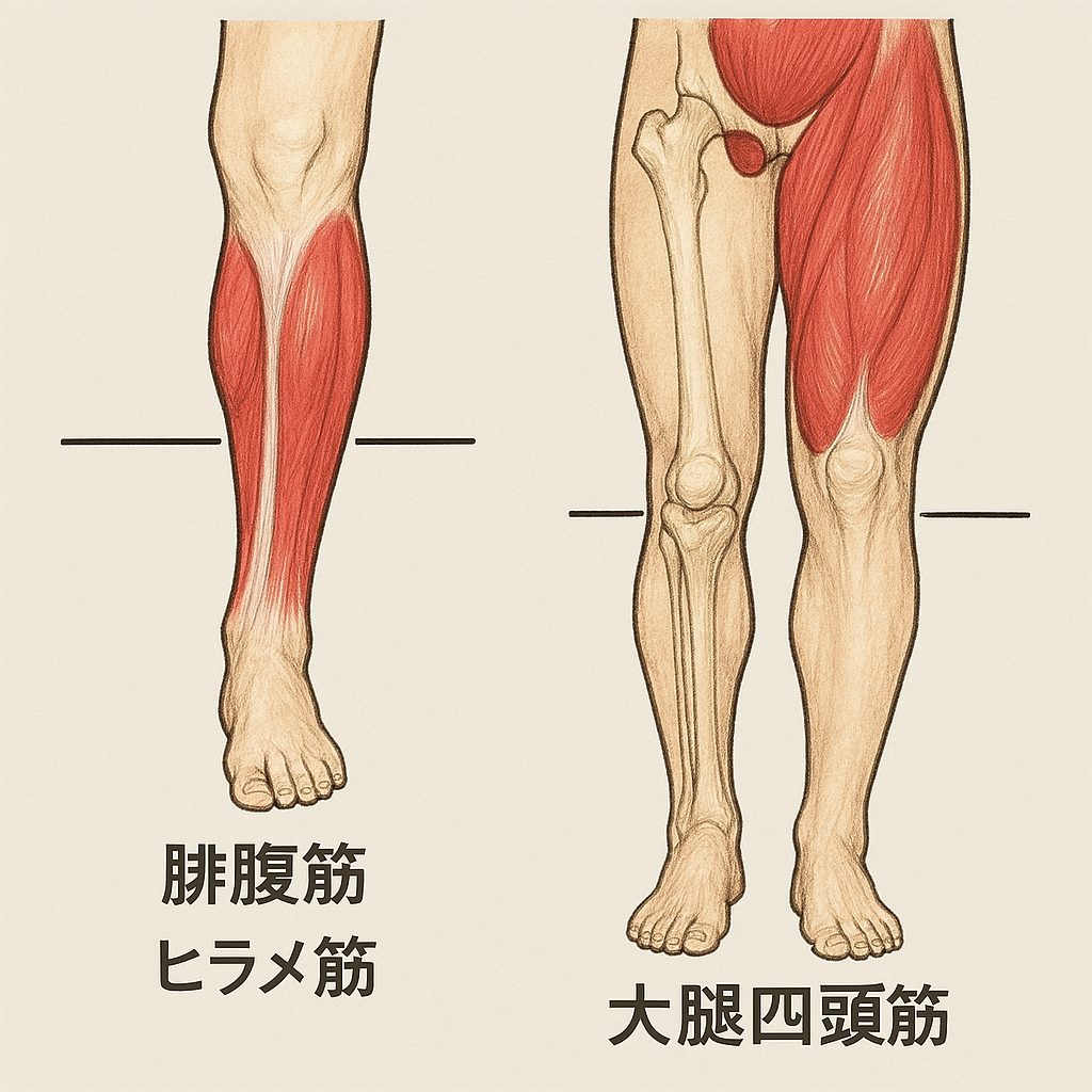 骨の長さそのものだけでなく、筋肉の付着位置や発達具合が「長さ」の認識に影響を与えている可能性も無視できません。例えば、ふくらはぎの筋肉(腓腹筋やヒラメ筋)の位置が低い場合、足首から膝までの距離が視覚的に短く感じられることがあります。逆に、太ももの筋肉(大腿四頭筋など)が膝上まで大きく発達していると、太ももの存在感が強調され、相対的に長く見えることにつながるかもしれません。また、太ももの前側が張っている状態は、脚のラインを立体的に見せる一方で、縦の長さを分断するような視覚効果をもたらす可能性も考えられます。このように、実際の骨の長さとは別に、軟部組織のボリュームや配置が、膝下と太ももの比率を決定づける大きな要因となっていることが推測されます。