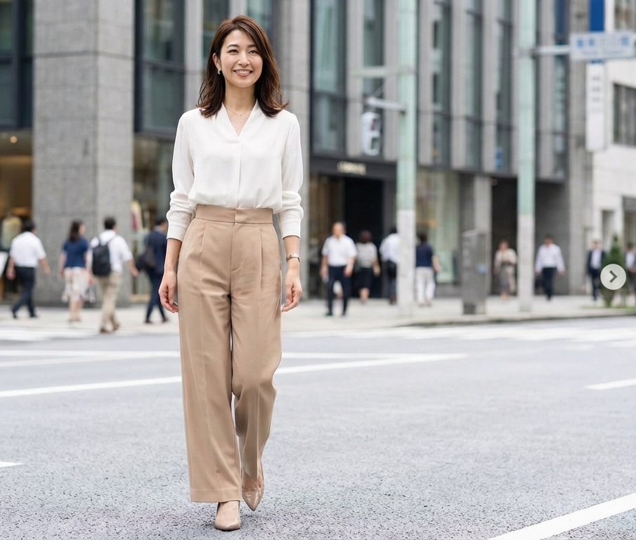 衣服の選び方やコーディネートの工夫は、即効性のある解決策として非常に有効であると考えられます。例えば、ハイウエストのボトムスを選択することは、腰の位置を高く見せ、太ももの始まりを実際よりも高い位置にあるように錯覚させる効果が期待できます。この際、膝の位置を明確にしないデザイン、例えばフレアスカートやワイドパンツなどを選ぶことで、太ももと膝下の境界線を曖昧にし、脚全体を一本の長いラインとして認識させる手法が考えられます。また、靴の選び方も重要です。甲が深く開いたパンプスや、肌馴染みの良いベージュ系のフットウェアを選ぶことで、足先までを脚の一部としてつなげて見せ、膝下の延長効果を狙うことができるかもしれません。