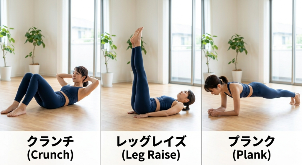 仰向けに寝て上半身を起こすクランチは、お腹の前面にある腹直筋の上部を鍛える基本的な運動として知られています。