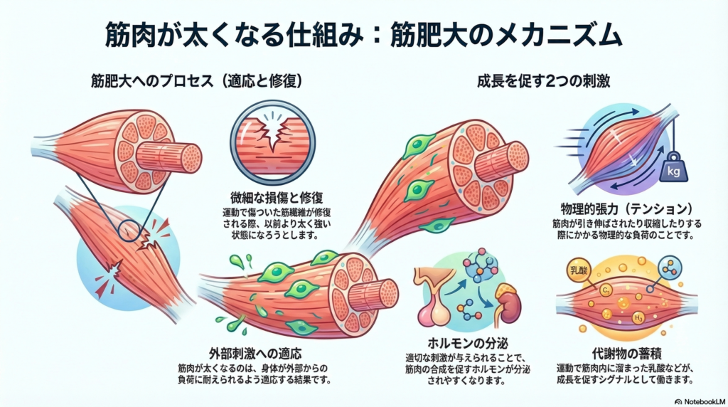 筋肉が太く大きくなる現象は、外部からの刺激に対して身体が適応しようとする結果として生じると考えられています。